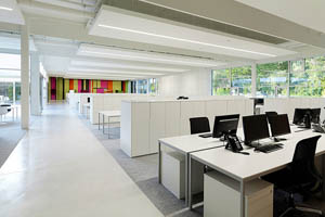 透過點、線、面的延伸與連結,形構出開闊的空間表情,在區域之間的界定上,